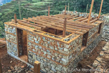 Die sechsmonatige indische Grenzblockade (2015/2016) und die damit entstandene Materialknappheit verzögerten zusätzlich den Baubeginn. Als alle Baumaterialien organisiert und die durch Nachbeben sowie die ausgeprägte Regenzeit immer wieder zerstörte Piste in unsere Projektregion wieder repariert war, konnte der Bau unseres Modellhauses beginnen.